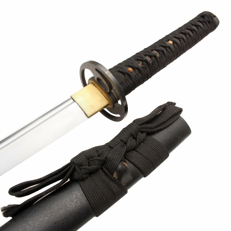 | Wakizashi sword w/ Tomoe Tsuba -1060 High Carbon blade -Wave designs in handle fittings -Handle features Dragon shaped menuki charms |