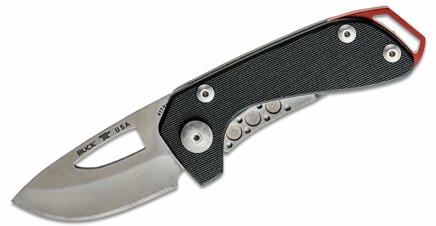 Compact but sturdy, the Buck Budgie is a slick new EDC designed with modern materials and cool features to enhance performance. With the smaller profile, the large thumb hole allows for easy, one-hand opening while the frame lock secures the blade during use. The S35VN blade ensures maximum edge retention and ease of resharpening for long term use. A rugged black G10 handle offers the grip and durability to match that of the superior blade performance. Accessorized with a pocket clip and lanyard hole, the Budgie can go anywhere.Â