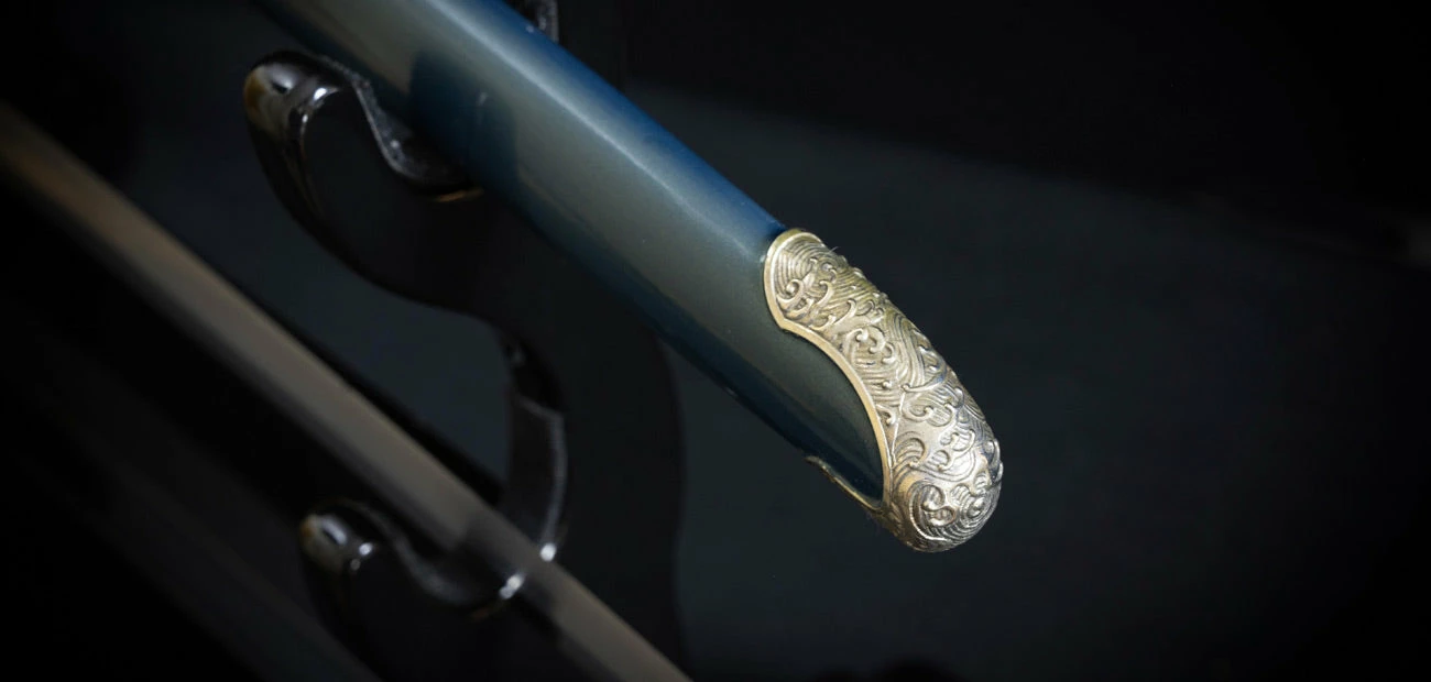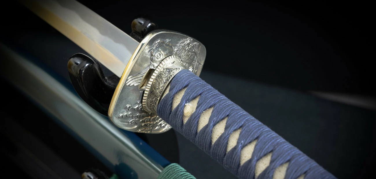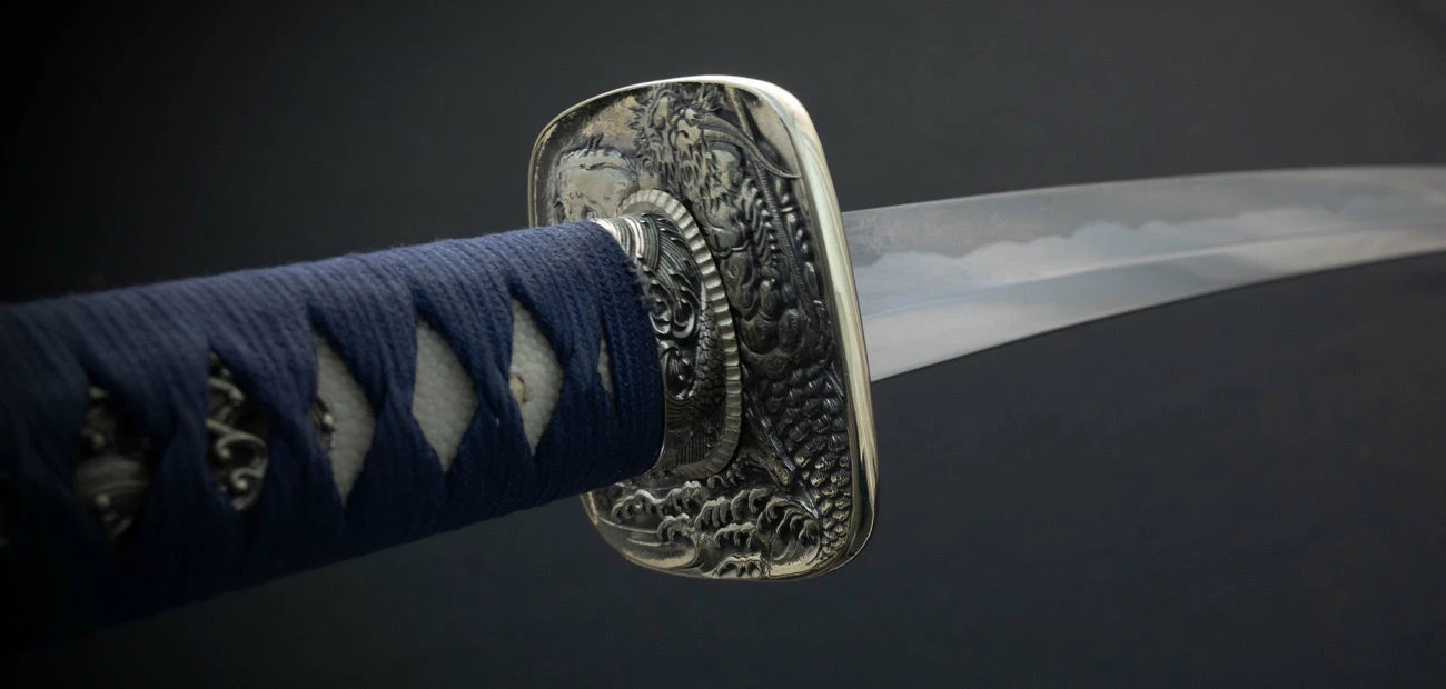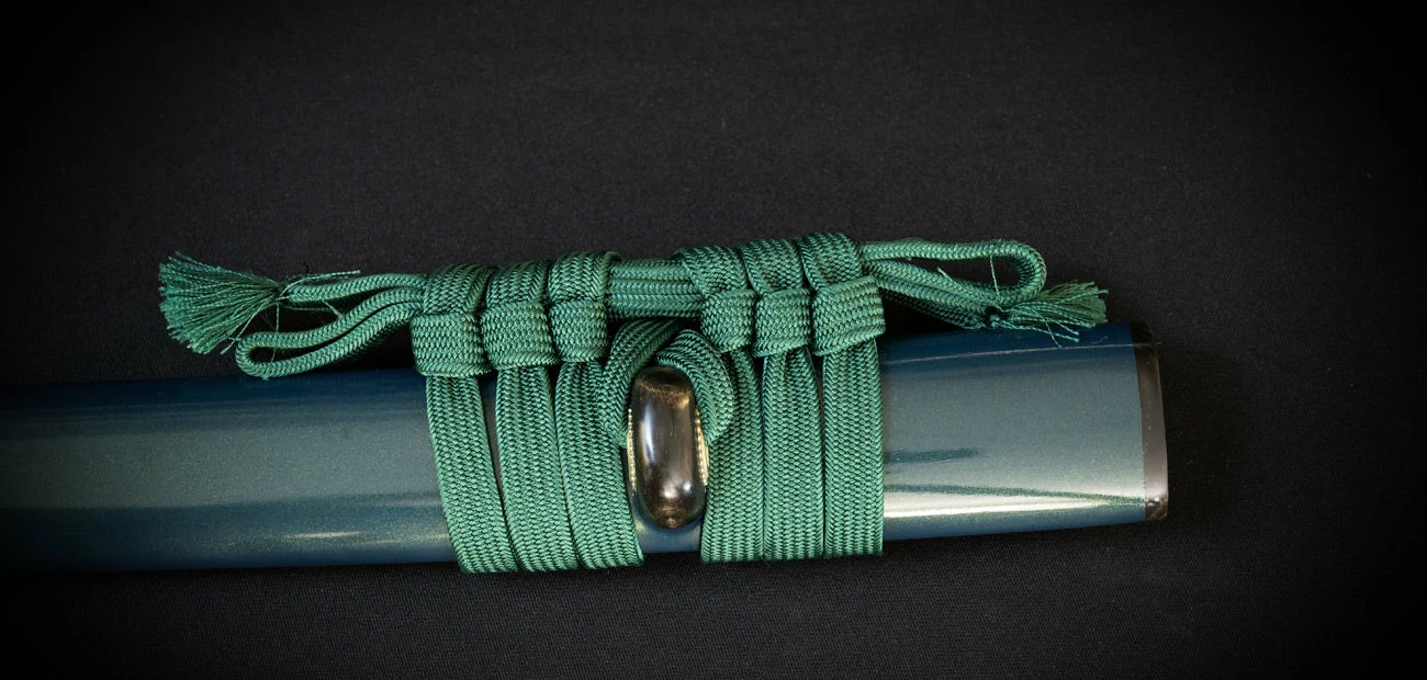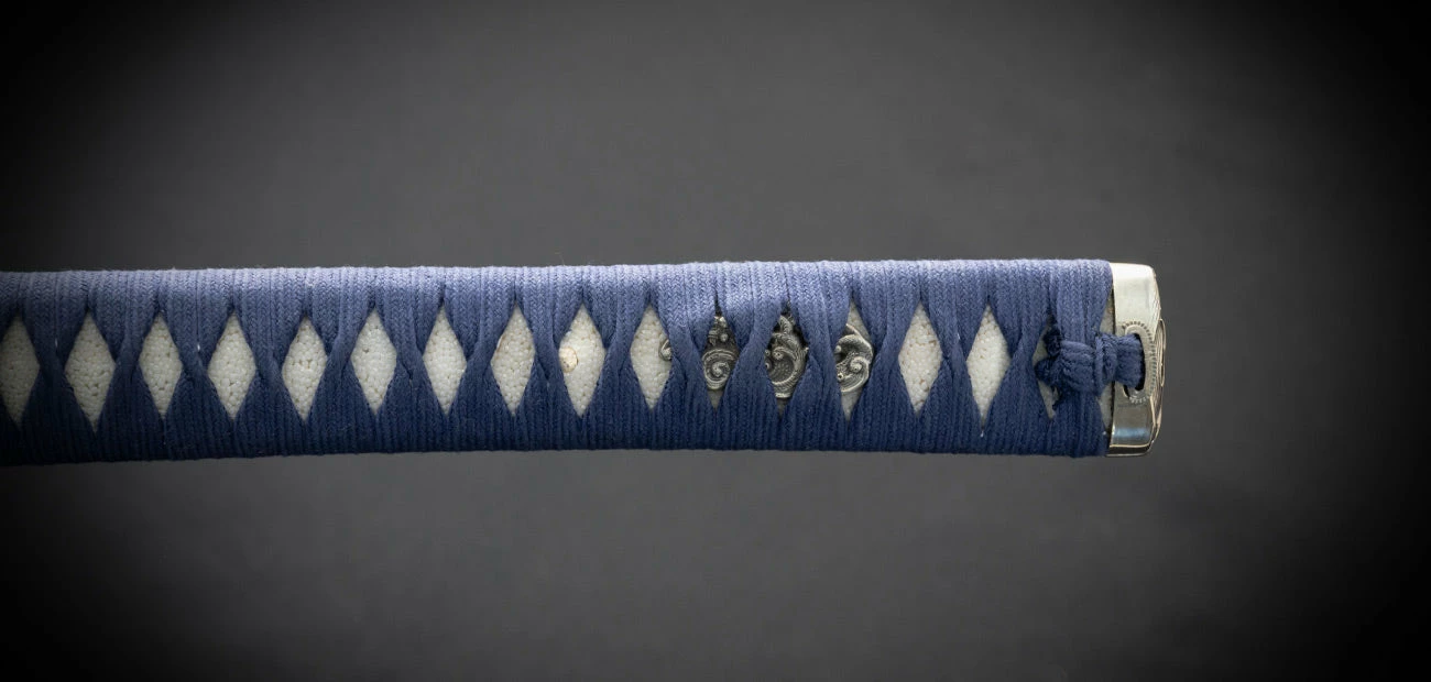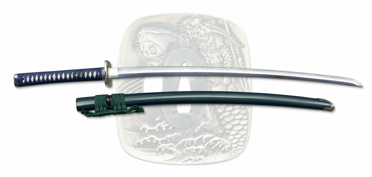 The Taikyu Katana embodies all the elements of endurance in master piece katana. The 27 ½” folded steel blade is a mixture of T10 and 9260 steels to give the hada clear appearance. The blade is light and quick in the hand. The 10 ½” tsuka is wrapped in teal Japanese silk over real same. The deep blue lacquered saya matches perfectly when light passes over it revealing a teal sparked reflection that is almost impossible to photograph. The furniture from the kashira to the kojiri features a turbulent wave them. The Taikyu Katana will please the most discerning collector of high end folded steel katana or those who just love sword art.