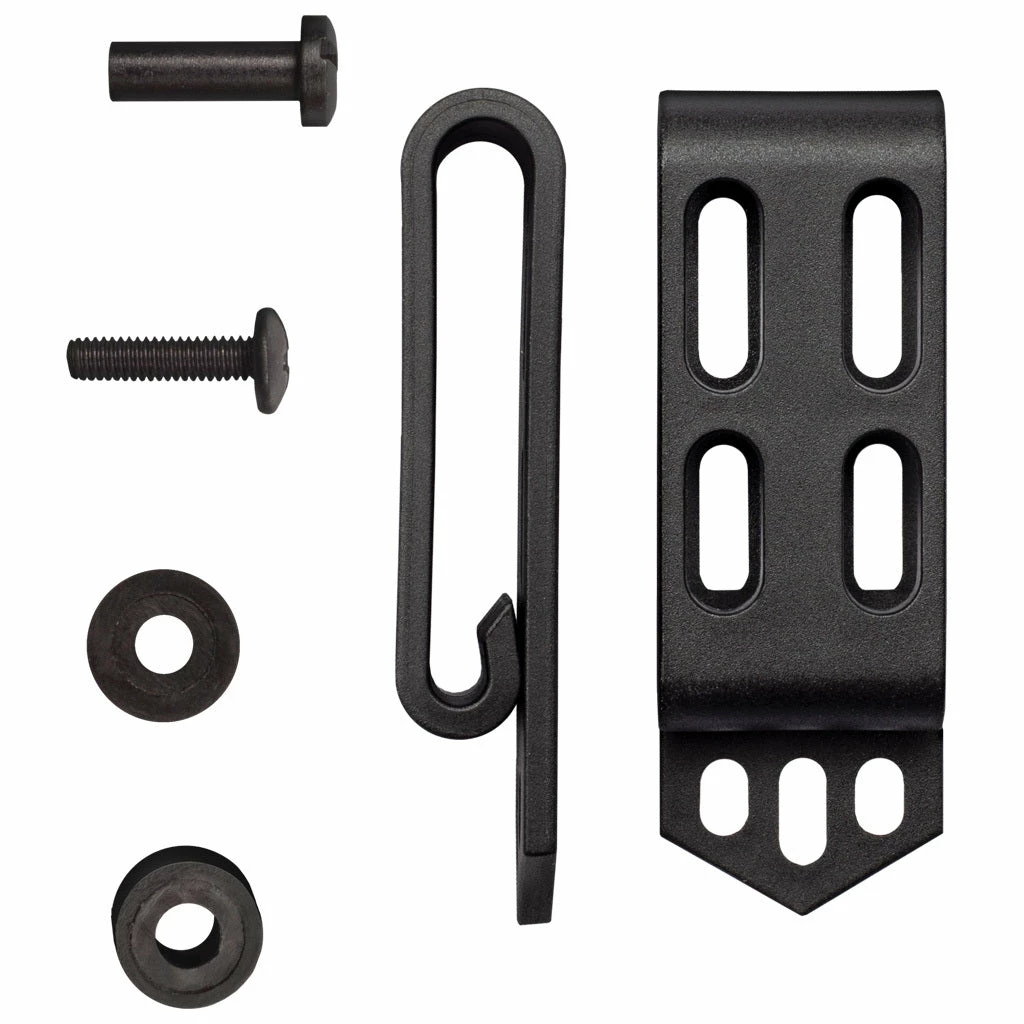 Our Secure-Ex C-Clips, invented by Mike Sastre of River City Sheaths, make it possible to attach your Cold Steel knives to belts up to 1-1/2 inches wide! Mikes clever design includes mounting slots that facilitate wearing your knife vertically, upside down, or even on a forward or backward slant! Theyre available in two sizes to accommodate large and small sheaths, and are supplied with all the essential hardware (screws and rubber washers). Plus, they can be attached to either side of your sheath so, if you want to, you can wear your knife inside your waistband! As an added bonus the C-Clips fit many other manufacturers and custom knife makers sheaths as well. Pack of 2.