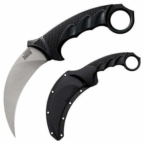 The Steel Tiger is a thoroughly modern tactical interpretation of the Indonesian Karambit. A design collaboration between Lynn C. Thompson and the late custom knife maker Steven Likarich, the Steel Tiger was designed to possess all the best features of this iconic hooked blade and to integrate them seamlessly with modern materials and styling. The Steel Tiger’s deeply curved and needle sharp AUS 8A stainless steel blade is vacuum heat-treated and sub-zero quenched, taper ground and given a stone wash finish for maximum strength, cutting power, edge retention and performance. The durable Griv-Ex core handle fully encapsulates the tang, emerging to create the bolster, thumb-shelf and distinctive finger ring. This core is then injection over-molded with premium Kray-Ex™, creating a superb, non-slip grip that won’t let you down even in when your hands are cold or wet. For safety and convenience the Steel Tiger comes with a Military style Secure-Ex® sheath that you can lash to your gear or retain on your person via the removable boot/belt clip.