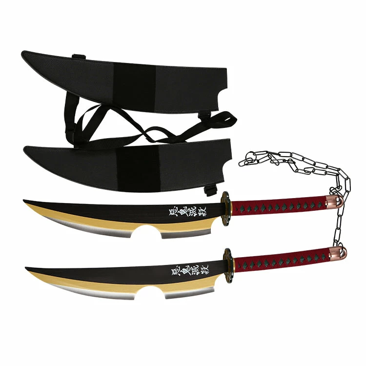 | Demon Slayer Tengen Uzui’s Twin Nichirin Swords -Flamboyant orange and yellow hamon along blade edges -Metal pommels can be joined together with included chain -Black Carry sheaths included |