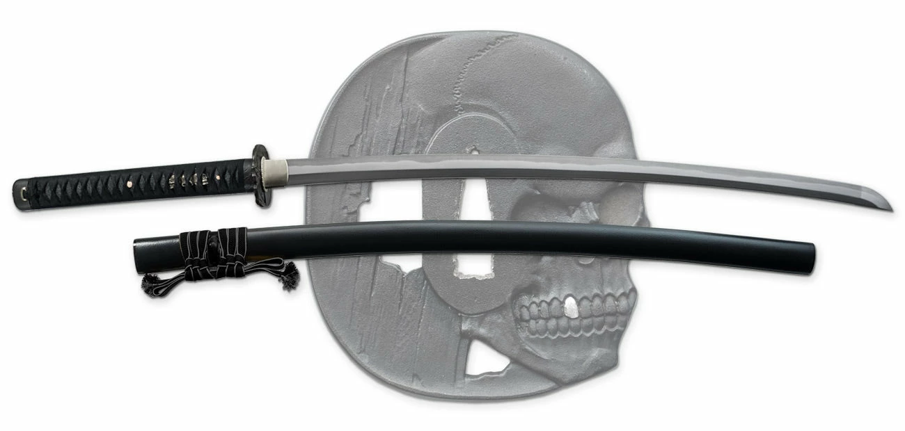 Blackest of the black and deadlier than death, the Shi Katana epitomizes the true function of the katana when carried to its ultimate end. When traditionally worn, the flash of the black skull shaped tsuba (guard) and kanji embossed fuchi-kashira (pommel) warns any would-be assassin that to challenge this warrior is to court your demise. The 11 ½” tsuka (handle) features a black-on-black tsuka-ito (handle wrap) and same (ray skin) handle contrasted by the triple silver skull menuki. A silver habaki (blade collar) and seppa (spacers) accent the 28” forged steel blade which rests in a hand carved, textured matte black saya. The saya is adorned with a buffalo horn kurikata (knob) and black sageo (cord).