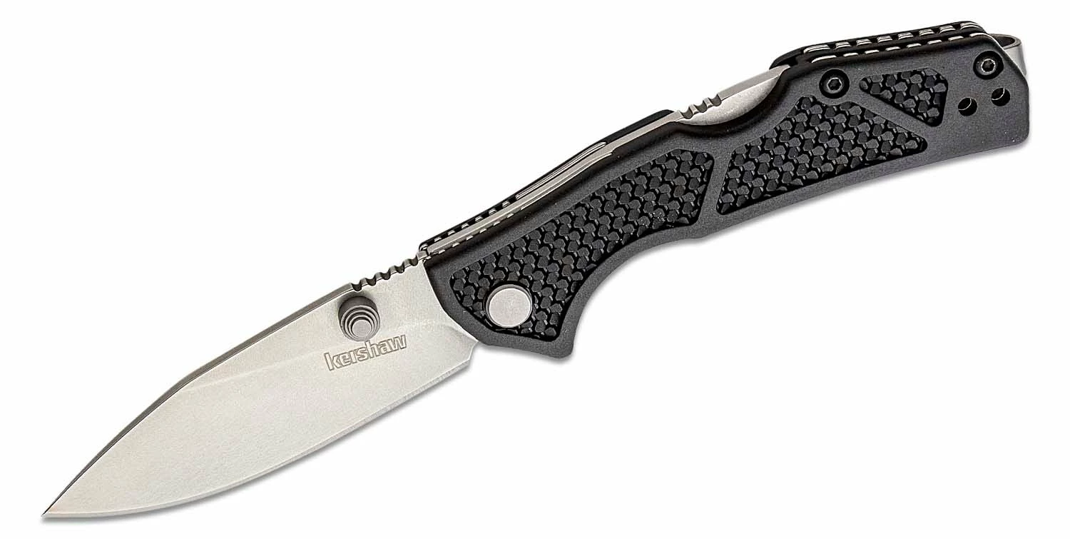 - Kershaw mid-lock folder; comfortable, textured glass-filled nylon handle