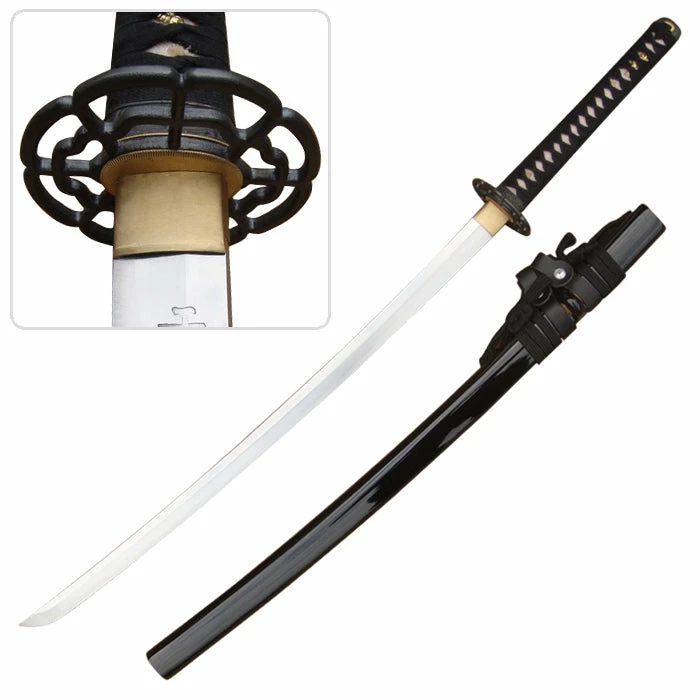 | Standard Practical Katana -1060 high carbon blade steel -Blade features characters describing Bushido -White ray skin and brass dragon menuki under black cotton wrap -Petal patterned Tsuba -Glossy black lacquered wood saya with leather mounting straps |