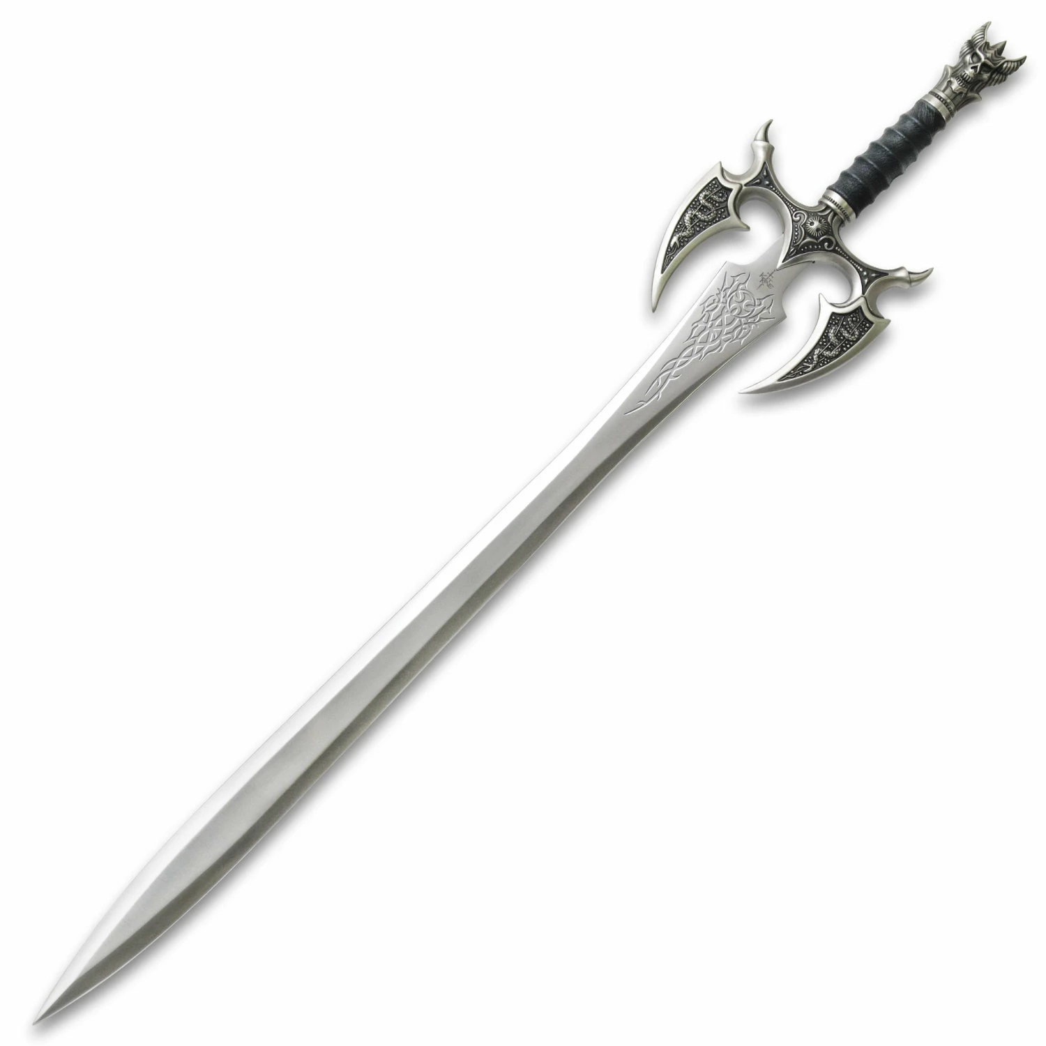 Kit Rae, well-known fantasy artist and weapon designer, crafted Kilgorin, a high quality sword from his epic mythological tale “The Tale of the Swords of the Ancients and Other Blades of Power”, and at your request, he is reissuing it! Kilgorin, the Sword of Darkness, was the second of the ten mighty swords forged with special and unique powers to maintain order and harmony in the fantasy world of Ammon. Kilgorin possessed the power to give its wielder the ability to cast darkness and enchantment over enemies. Measuring 36″ overall, this sword features an intricately detailed and distinctive cast metal pommel and guard with an antique silver finish. The ridged ABS handle is wrapped in genuine black leather. The 25 1/2″ blade is satin-finished, 3Cr13 stainless steel with a deep etched runic design. This item comes with a certificate of authenticity and an 18″ x 24 1/2″ full color art print, “Vaelen Confronts Darkness”.
