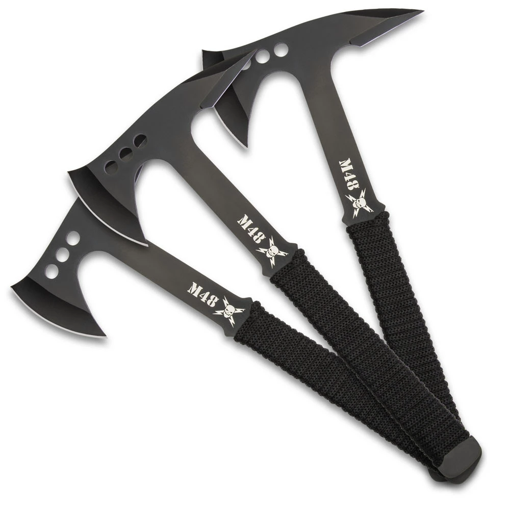 Throw just like a professional with the M48 Pro Throwing Axe Set, which has three axes that are each perfectly balanced in weight and design. The axes have 5 1/5” wide, black 3Cr13 stainless steel heads with 2 1/2” blades and penetration points on the back side. The full-tang handles are wrapped in black cord for a comfortable, slip-free grip, allowing you to throw with ease. The 10 3/4” overall axes can be housed in their tough, 1068D nylon sheath for carry and to protect the blades.
