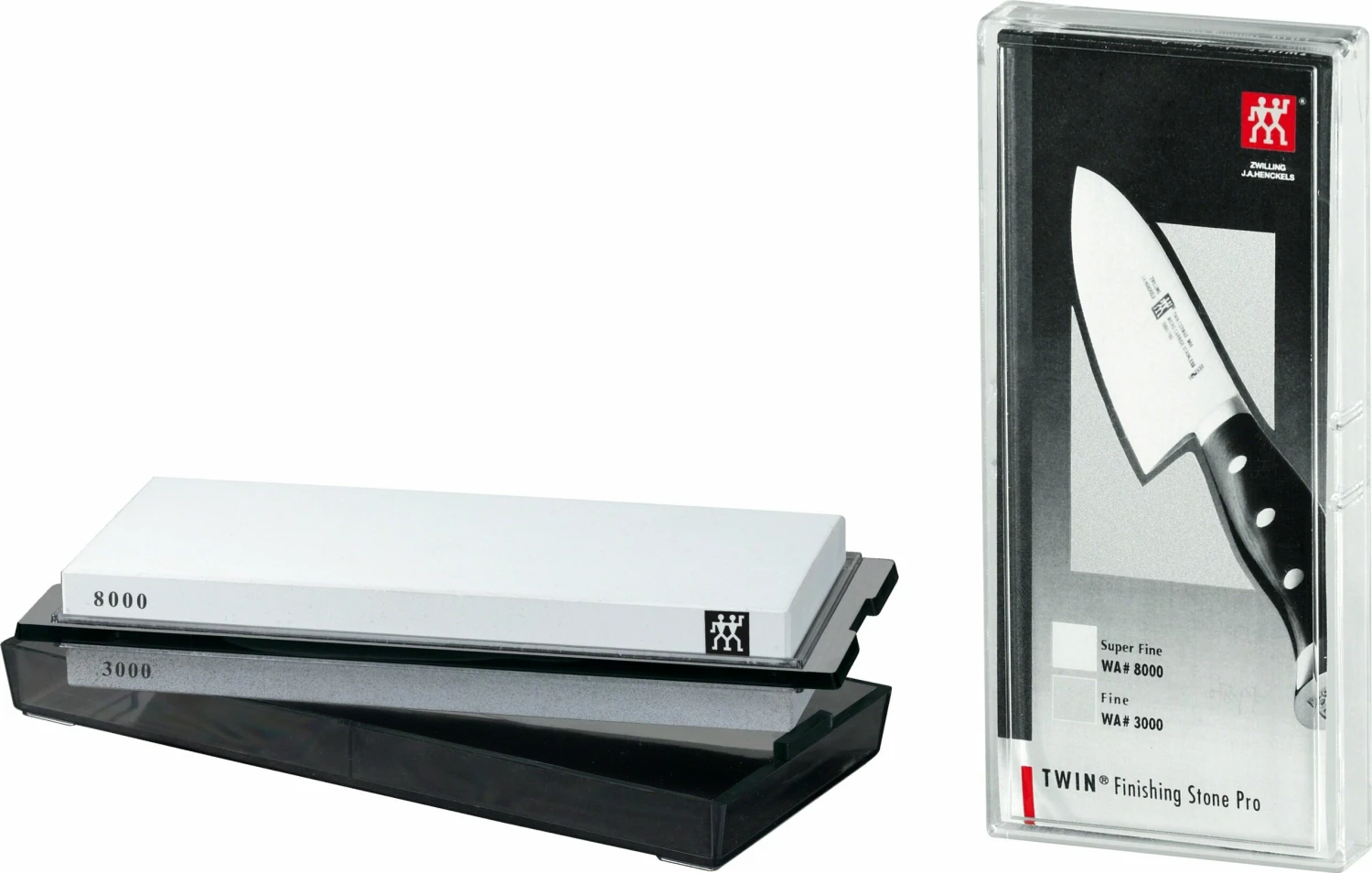 A sharpening stone, or whet stone, is the best method of sharpening fine edge knives because of the control it allows. Like sandpaper, sharpening stones come in a variety of roughness or grain; the coarser the finish the more abrasive. Whet stones can use water or oil as a lubricant; water stones are much more convenient. For regular sharpening with a stone, use the TWIN® Stone Pro (250 and 1000 grain). TWIN® Finishing Stone Pro is used for a professional, scalpel-like and mirror finished edge (3000 and 8000 grain). Both stones are ceramic, manufactured materials that require minimal water and last longer than natural stones. Sharpening with the TWIN® sharpening stones may need some practice but the results are well worth the effort.